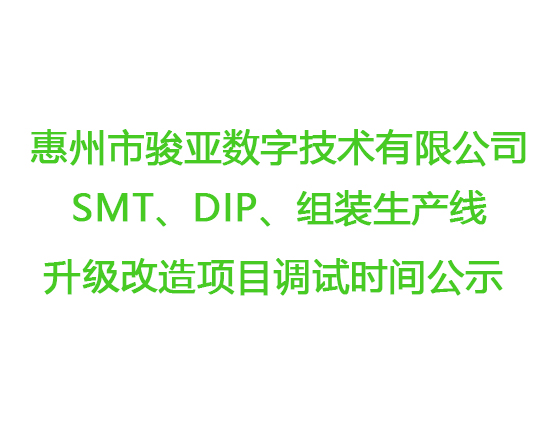 惠州市駿亞數(shù)字技術(shù)有限公司SMT、DIP、組裝生產(chǎn)線升級(jí)改造項(xiàng)目調(diào)試時(shí)間公示